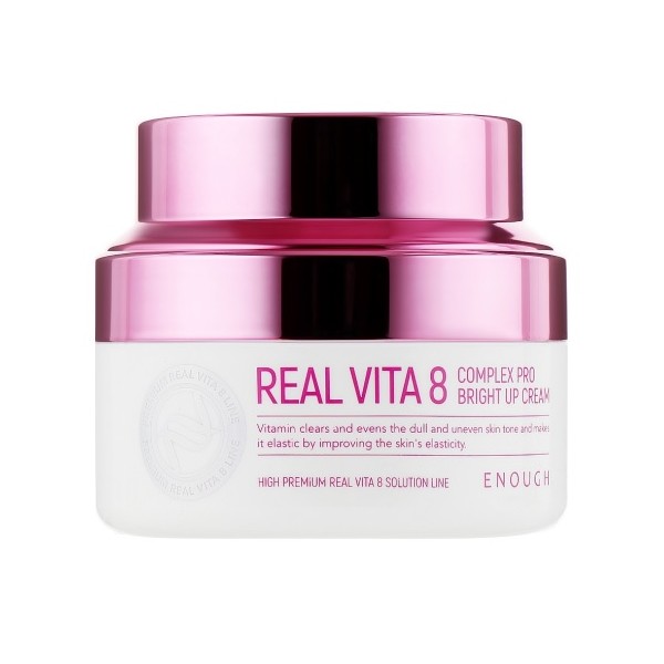 Крем для обличчя освітлюючий з вітамінами Real Vita 8 Complex Pro Bright Up Cream від бренду **ENOUGH** — це багатофункціональний засіб для відновлення та догляду за шкірою. Завдяки комплексу з 8 вітамінів крем ефективно освітлює тон шкіри, допомагає впоратися з тьмяністю та слідами втоми, вирівнює колір обличчя й надає йому природного сяйва.